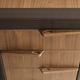Le linee asimmetriche della pianta rettangolare, con un lato corto e uno lungo inclinato, restituiscono leggerezza visiva e i tanti dettagli funzionali (il ripiano per i libri sul lato visitatori, la cassettiera e l’antina lato utilizzatore per riporre con ordine i documenti e il pc, le maniglie in legno massello, e i cassettini incassati nello spessore del top)evidenziano il suo valore estetico.