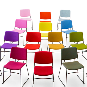La collezione include opzioni impilabili con basi a quattro gambe o slitta, oltre a versioni con gambe in legno o trespolo (con o senza ruote). La possibilità di aggiungere braccioli e scegliere tra la versione sedia o sgabello amplifica le opportunità di utilizzo, rendendola ideale per sale riunioni, uffici dinamici e spazi multifunzionali.